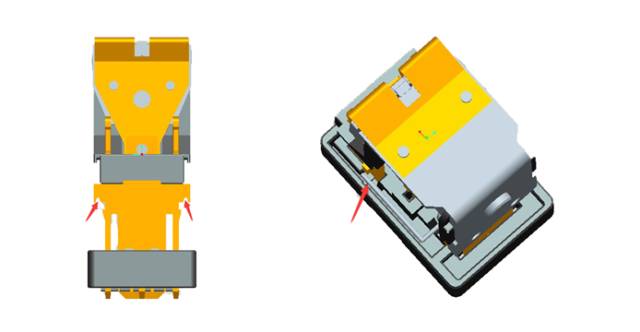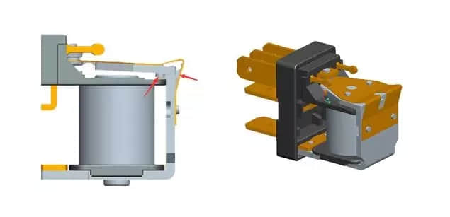 2、衔铁抗震动结构:汽车使用环境苛刻,特别是在震动上对继电器的抗震动能力要求高,所以更新换代后MAA在衔铁上设计2个限位凸块,将衔铁搭配在轭铁刀口位置限位,防止外界震动、跌落对簧片产生形变,从而提高了产品的参数的稳定性,提升继电器的使用寿命。